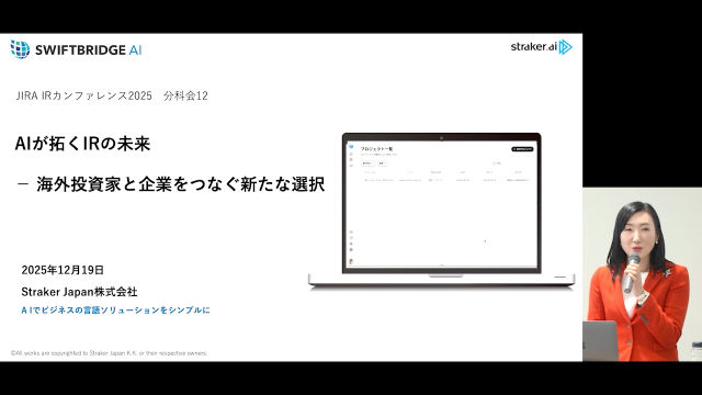 アーカイブ配信 講演映像 IRカンファレス2025分科会より AIが拓くIRの未来 - 海外投資家と企業をつなぐ新たな選択 AIを活用した新しいIRソリューションで、企業は人的な制約を超え真に伝えたいメッセージを世界の投資家へスピーディに届けられます。 講師:ストレイカーグループ 日本・アジア地域 戦略・事業統括シニア・バイスプレジデント 三森 暁江 氏